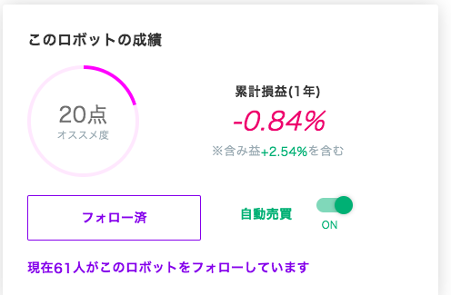 フォローしているロボットで、元金10万円で運用したと仮定した結果が表示されています。