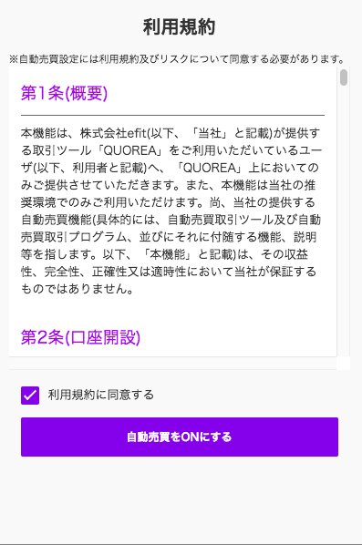 この画像のように、自動売買に関する規約が表示されますので、確認してチェックします。