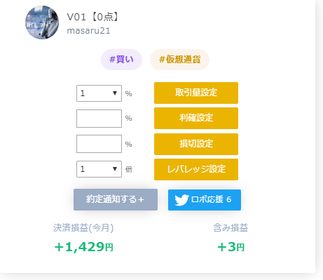 私は、2万円の元金で、AIの設定で取引量の設定とレバレッジの設定をしています。