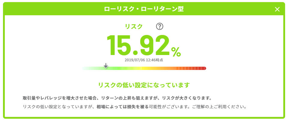 自動売買のリスクが表示されるようになりました 2019/7/6 クオレア, 入門 スポンサーリンク このウェブサイトは、アフィリエイト広告を利用しています。 QUOREA(クオレア)は、この度、自分の自動売買のリスクを解析できるようになりました。 この画像は、私のリスクです。 このような感じで、利用している自動売買の設定の状況を知ることができます。 詳しいことは、QUOREA(クオレア)のサイトで、確認してください。