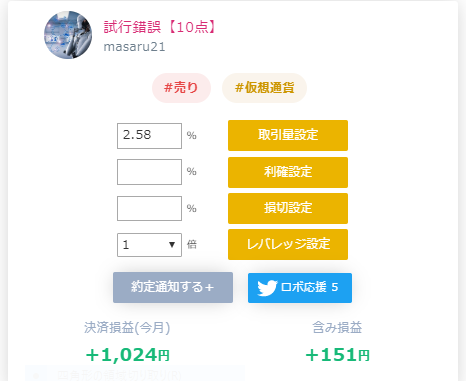 今朝まで21000円あったビットコインの価値が、19000円位にまで減ってしまっているので、新しいロボットを作ることも含めて今、試行錯誤を続けています。