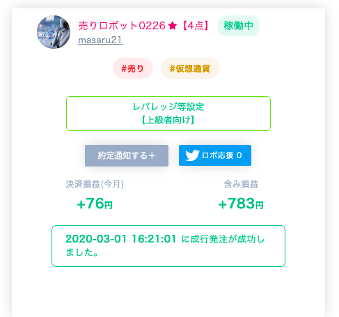 評価が70%以上あるなど利益があるような印象を受けますが、実際は、少額で自動売買行うとロボットが売買タイミングを感知して取引しようとしても資金不足でできない事があるため、優秀なロボットを自動売買に採用できても予算が伴っていないと利益を出すことは、難しいのかもしれないです。
