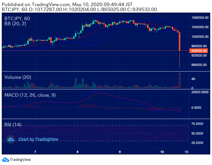 Twitterを見ていて、ビットコイン が急落した様子のキャプチャを投稿していた人が居ました。