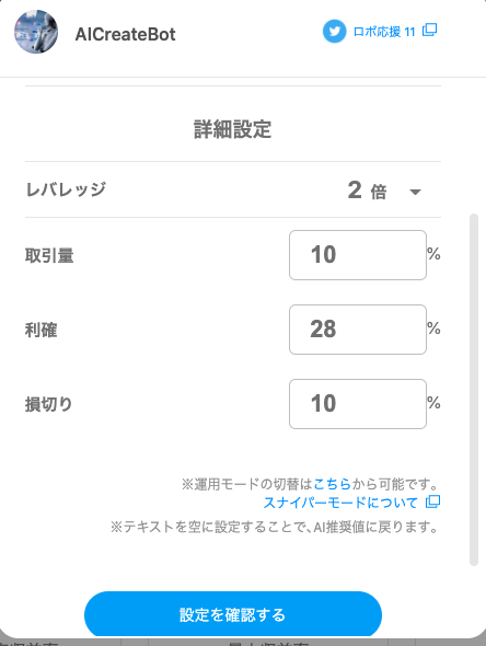ロボットのレバレッジ、取引量、利確、損切りの項目設定は、下記の手順で行います。