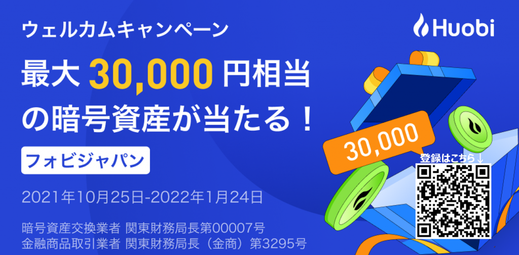 Huobi Japan(フォビ ジャパン)は、2021年10月25日(月)〜2022年1月24日(月)まで最大30,000円相当の暗号資産が当たるウェルカムキャンペーンを実施しています。